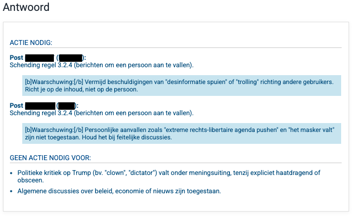 Zaken als bvb "propaganda" of "narcist" zijn gewone woorden die niet eens altijd beledigend zijn. Komt er een lijst met woorden die door UB goedgekeurd zijn? Andere zaken zijn verwijzingen naar beledigingen/uitspraken door anderen zoals "pussygrabber" en ook dat is iets anders dan een UB'er zo te noemen. Ik vrees een beetje voor de doos van pandora in de veronderstelling dat Pandora een toegelaten term is :)