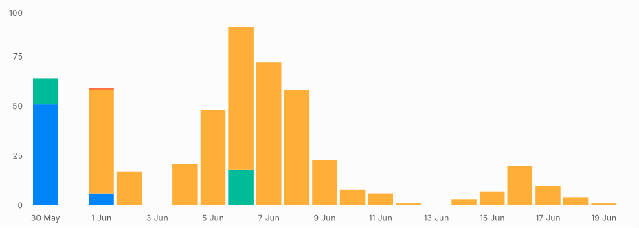 Het gebruik van de tool blijft beperkt (onderstaande bevat #requests, ook requests van voor de release, onze tests dus. Oranje is het huidige model):