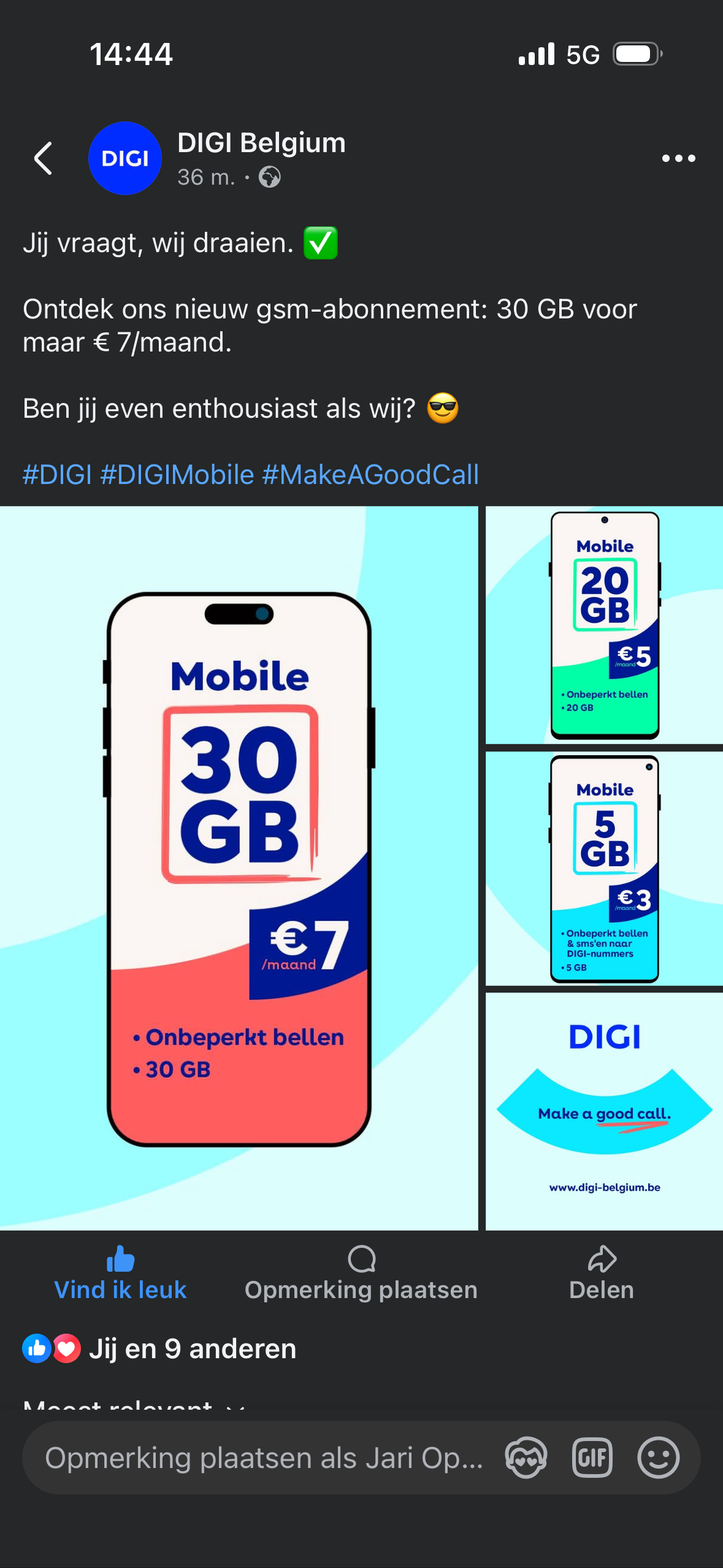 Ik zie op MyDIGI sinds vandaag ‘DIGI mobile 15GB + 5GB’ staan… lijkt me dus een aanpassing van het oude tariefplan?Nordic schreef:Dus voor bestaande klanten geen wijziging voor sms in de 5€ bundel, maar gaat de data dan ook naar 20Gb of blijft deze op 15? Op MyDigi zie ik mijn teller voor oktober op 15Gb staan.