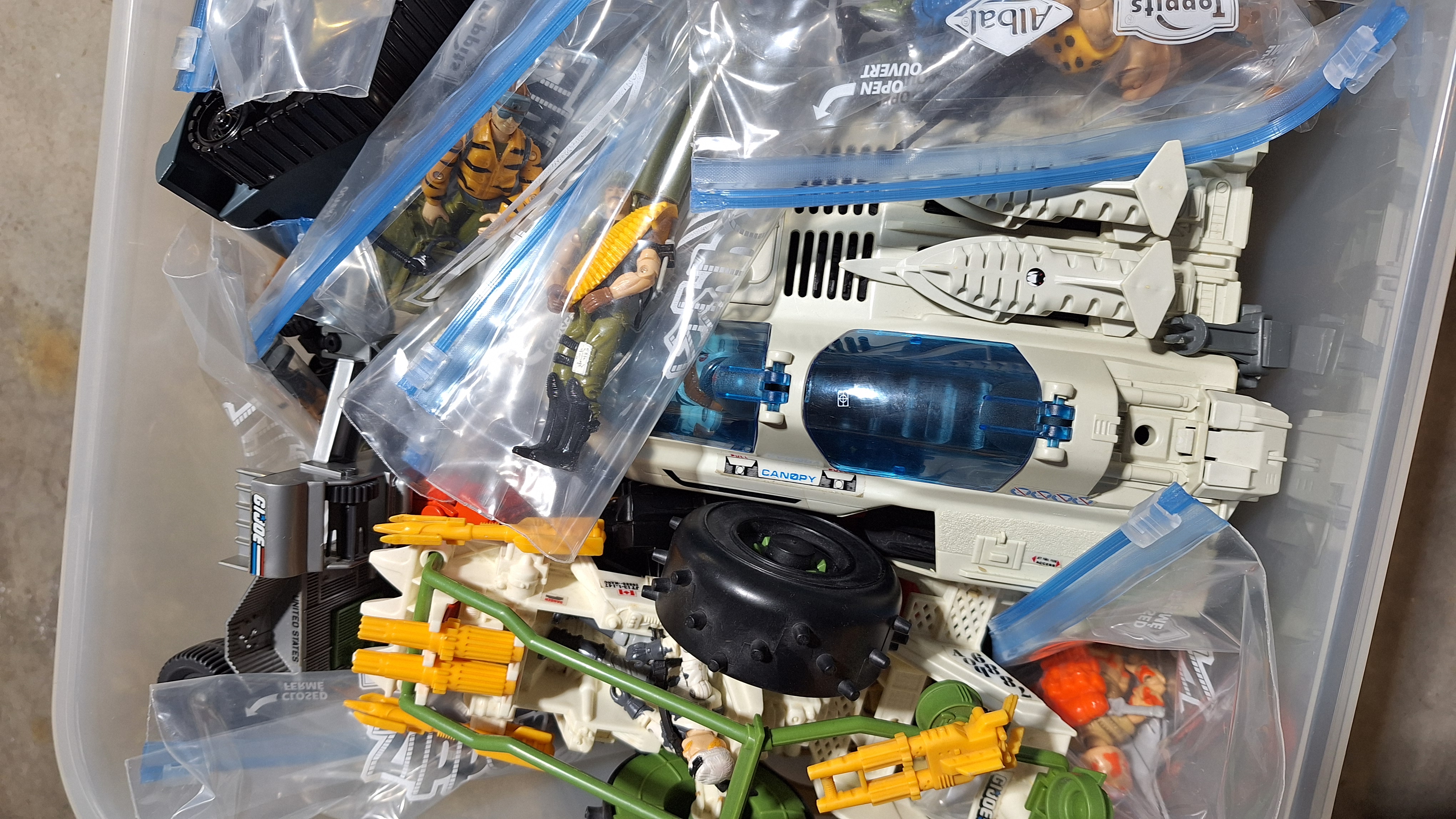 Object + omschrijving: selectie G.I. Joe uit mijn eigen jeugd. Staat al jaren in de garage, misschien heeft er iemand interesse. Ik heb ooit eens een inventaris gedaan, zie hieronder. Ik zou zeggen 80-90% compleet, goed verpakt, maar uiteraard gebruikt